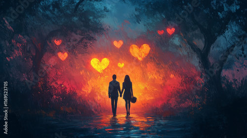 Romantic Couple Walking Through a Heart-Lit Pathway in a Dreamy Forest for Valentine’s Day