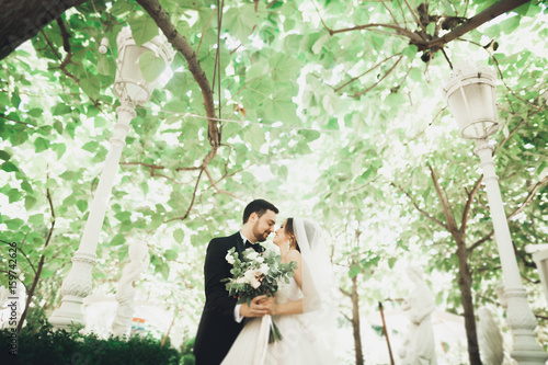 Romantic, fairytale, happy newlywed couple hugging and kissing in a park, trees in background