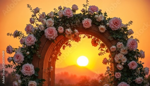 Romantic floral arch with pink roses at sunset, creating a beautiful wedding backdrop