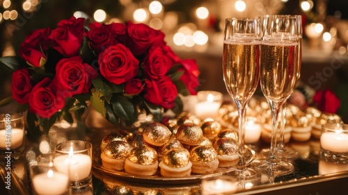 Romantic setting with roses champagne and gold desserts