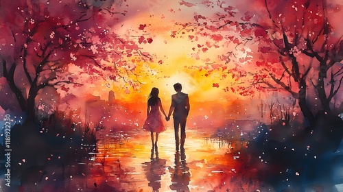 Romantic watercolor painting of a couple holding hands in a sunset-lit park with cherry blossoms