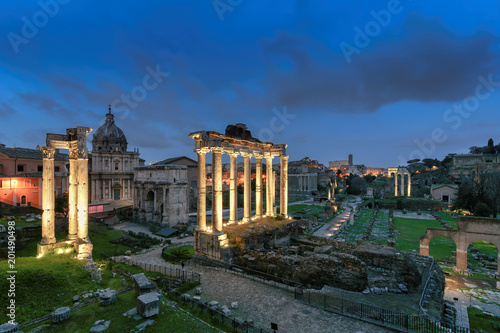 Rome Forum with ruins of ancient architecture at night. Italy.