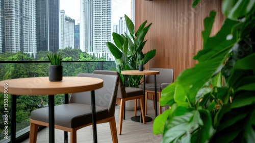 Rooftop bar at a high-rise hotel Concept, Scenic Rooftop Bar at High Rise Hotel Surrounded by Lush Tropical Plants and Urban Skyline Views