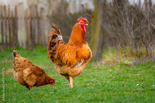 Rooster and hen in the farm backyard