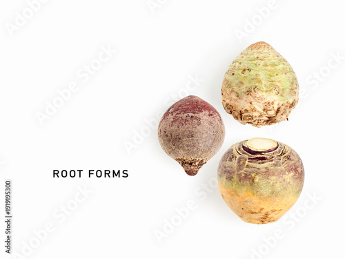 Root vegetables including beetroot, turnip and celeriac arranged in minimal flat lay composition isolated on white background