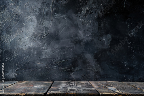 Rough black wall background with aged wooden floor