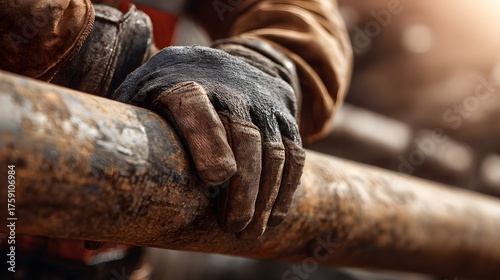 Rough-textured glove grips a rusty metal pipe in close-up.