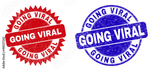 Round and rosette GOING VIRAL seal stamps. Flat vector distress seal stamps with GOING VIRAL title inside round and sharp rosette form, in red and blue colors. Imprints with unclean surface,