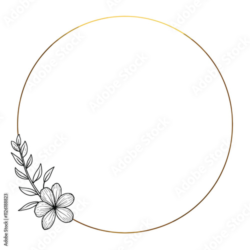 Round golden floral wreath frame with hand drawn flowers and leaves decoration