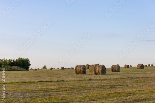 round stacks of pressed hay on the field