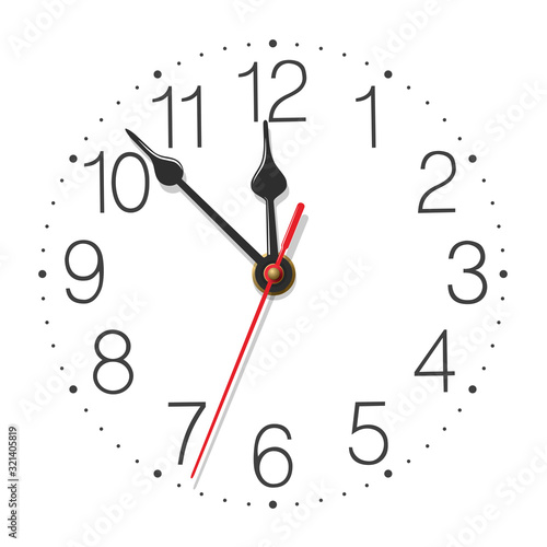 Round wall clock face with glossy metallic hands isolated on white background