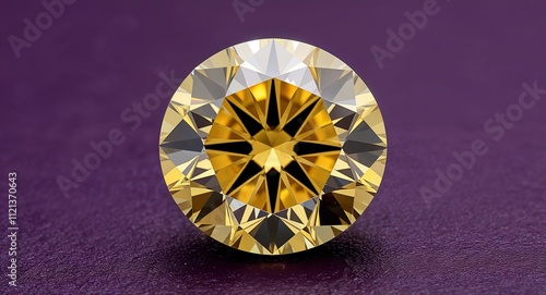 Round yellow diamond brilliant golden hue sparkling facets on a deep purple background