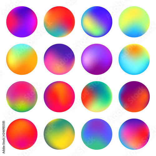 Rounded holographic gradient sphere button. Multicolor green purple yellow orange pink cyan fluid circle gradients, colorful soft round buttons or vivid color spheres flat vector set