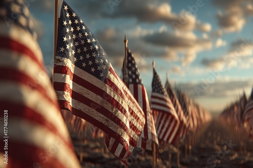 Row of American Flags Waving Proudly Under a Dramatic Sunset Sky with Golden Light