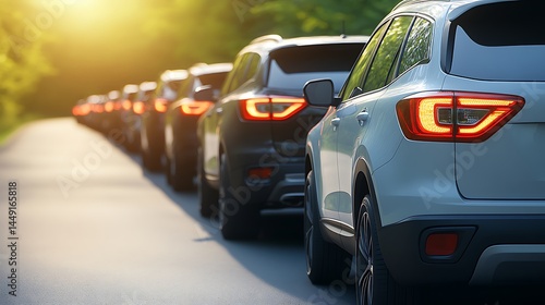 Row of cars on scenic road bathed in sunlight showcasing automotive design