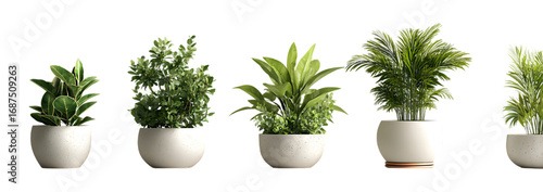 Row of potted houseplants with green leaves in simple white pots isolated against a dark backdrop