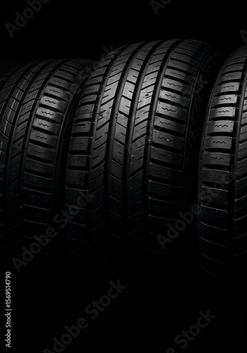 Row of tires showing treads and textures in monochrome studio shot
