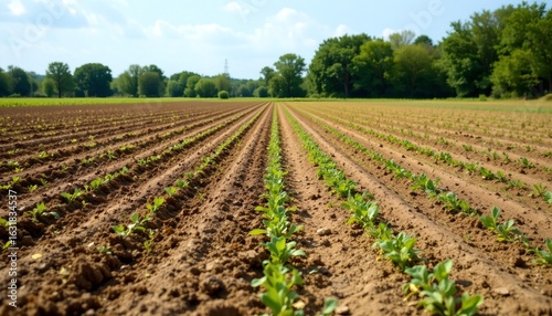 Rows of crops stretching across a cultivated field, with a backdrop of trees and a clear blue sky.