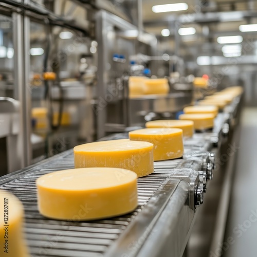 Rows of Fresh Cheese Wheels on a Conveyor Belt in a Modern Dairy Factory Production Line Industrial Setting with a Shallow Depth of Field