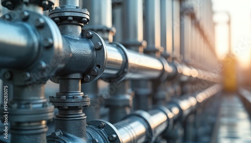Rows of industrial metal pipes with flanges and bolts. Network of conduits for fluid or gas transport. Modern infrastructure for energy or water supply at sunset.