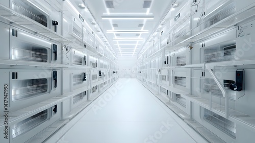 Rows of organized shelves and trays in a clean minimalist indoor environment designed for efficient insect breeding and cultivation