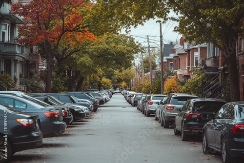 Rows of Parked Cars Line the Residential Street in an Urban City Setting