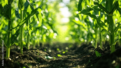Rows of vibrant organic corn stalks growing in sunlight