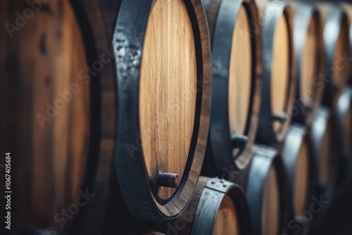 Rows of wooden barrels, stacked in a dimly lit wine cellar, their rich brown wood and iron hoops, creating a sense of history, tradition, and the promise of aged wine.