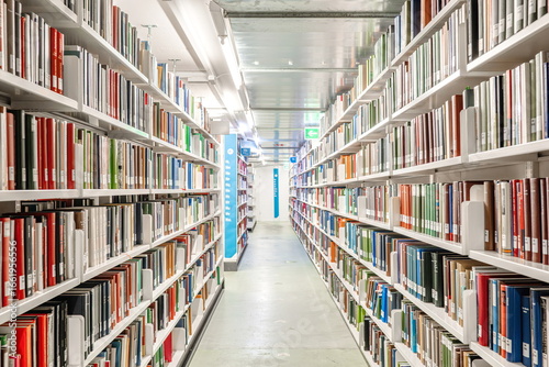 Rows or organized books stacked on bookshelves inside the library. Wide angle, diminishing perspective, shallow depth of field, blurry background, no people