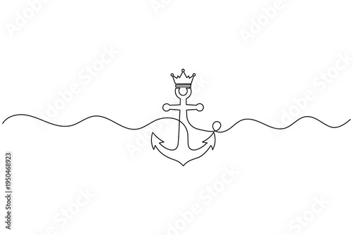 Royal Anchor with Crown Icon Continuous One Line Drawing Minimalist Nautical Outline Isolated on White Background