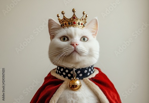 Royal white cat wearing a crown and red cape with polka dot collar, posing majestically against a neutral background, exuding confidence and charm