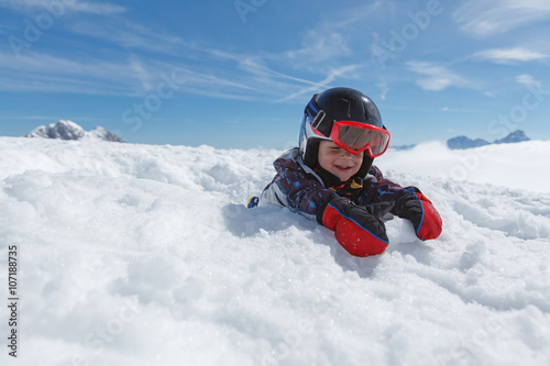 Roztomilý malý lyžař a alpské panorama.