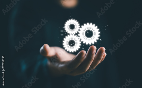 RPA, Business robotic process automation concept. Businessman hold virtual gear icon for improve productivity and management efficiency.