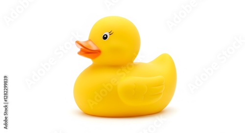 Rubber Duck Toy on White Background, Frontal Eye-Level Shot, Playful Bath Accessory