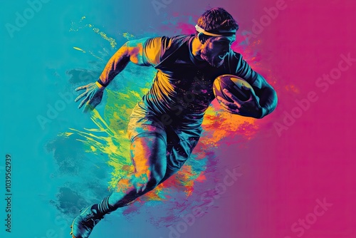 Rugby Player Running with Ball Against Colorful Background