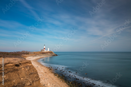 Rugged coastline leading to an old lighthouse protecting the island. Montauk Point, New York.