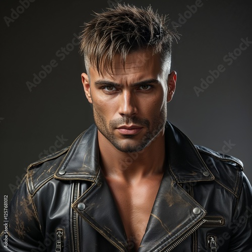 Rugged Man Portrait in Leather Jacket with Intense Expression Against Dark Background