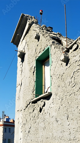 Ruined building facade, single green window, clear sky, city background, urban decay stock photo
