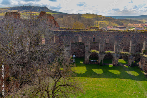 Ruined walls of a medieval citadel fortress. Cracked brick walls and decaded window arches can be seen in the photo. Citadel walls in ruin with arches and collumns.