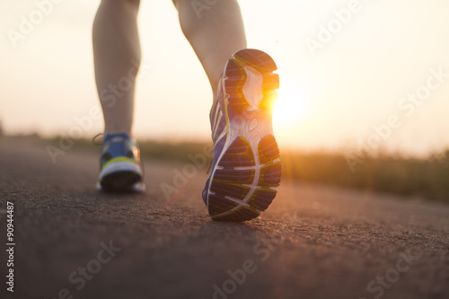 Runner feet running on road closeup on shoe