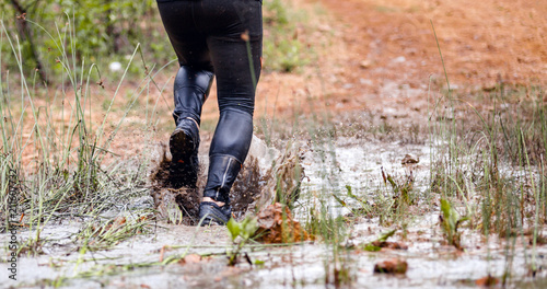 Running through dirty puddle splashing mud, cross country trail