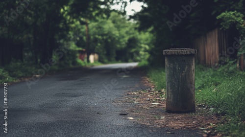 Rural asphalt road with a weathered metal post beside it, leading into a lush green forest.