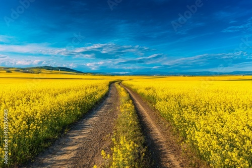 Rural dirt path through vibrant yellow canola fields under blue sky