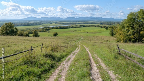Rural road descends to valley, mountain view, sunny day