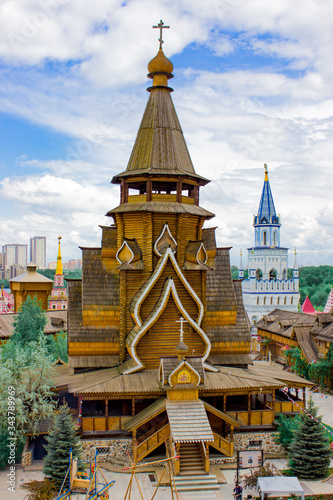 Russia Moscow. Izmailovsky Kremlin. Wooden church on the square in the Kremlin.