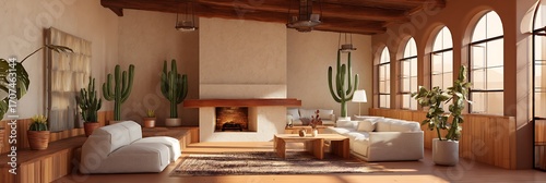 Rust palette interior lounge with modern adobe elements and cactus art