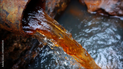 Rust-colored water cascades from a corroded pipe into a pool, droplets suspended mid-air. The metallic residue tints the water, creating a stark visual of contamination.