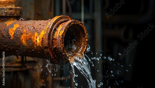 Rusted Industrial Water Pipe Leaking from Severe Corrosion on Dark Background