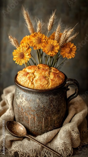 Rustic Autumn Still Life with Homemade Bread, Marigold Flowers, and Wheat Sprigs in a Pottery Mug