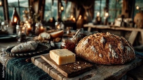 Rustic Bakery Table with Freshly Baked Bread, Cheese, and Jam in Cozy Ambiance